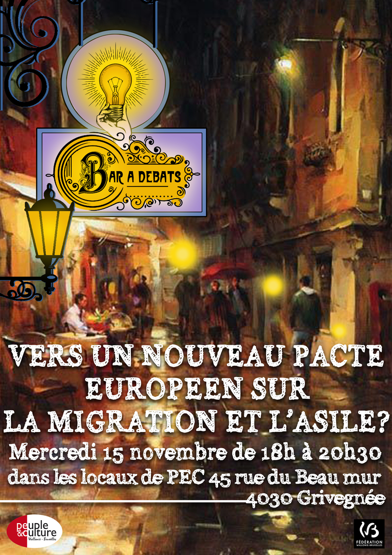 Mais de quoi s’agit-il vraiment ici ? Quels sont les enjeux de ce Pacte et quel futur entend-il dessiner ? Pour ce Bar à Débat, Peuple et Culture vous propose de décrypter tout cela afin de nous questionner collectivement sur la cohérence et le réalisme de ce qui semble être un pas de plus vers l’Europe forteresse. Une fois aux faits, nous débâterons sur des propositions que nous pourrions faire pour imaginer un Pacte sur la migration et l’asile qui soit véritablement respectueux des droits fondamentaux.