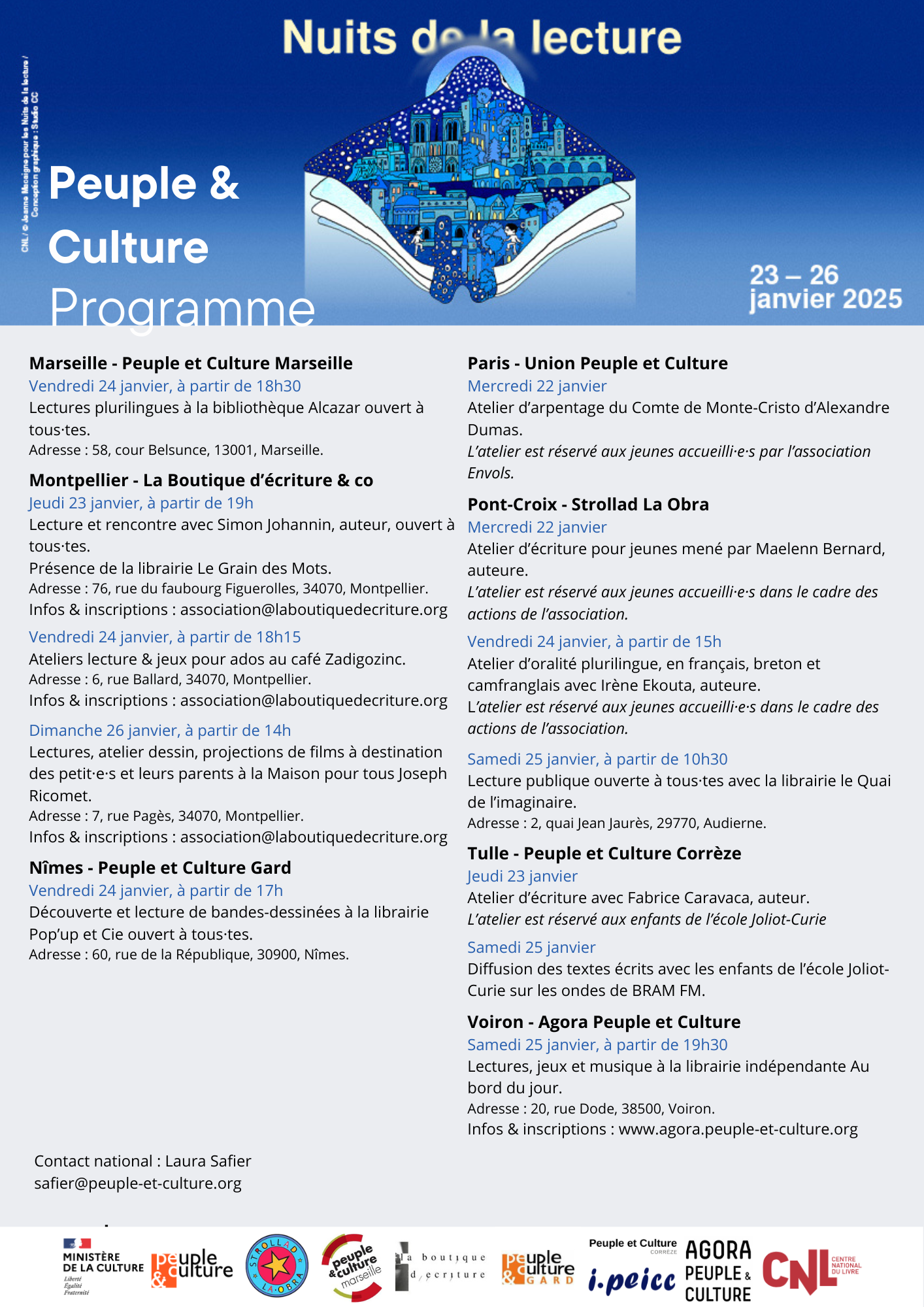 Comme tous les ans nos associations se mobilisent pour vous proposer lectures, ateliers d'écriture et autres propositions artistiques et culturelles dans le cadre des Nuits de la Lecture